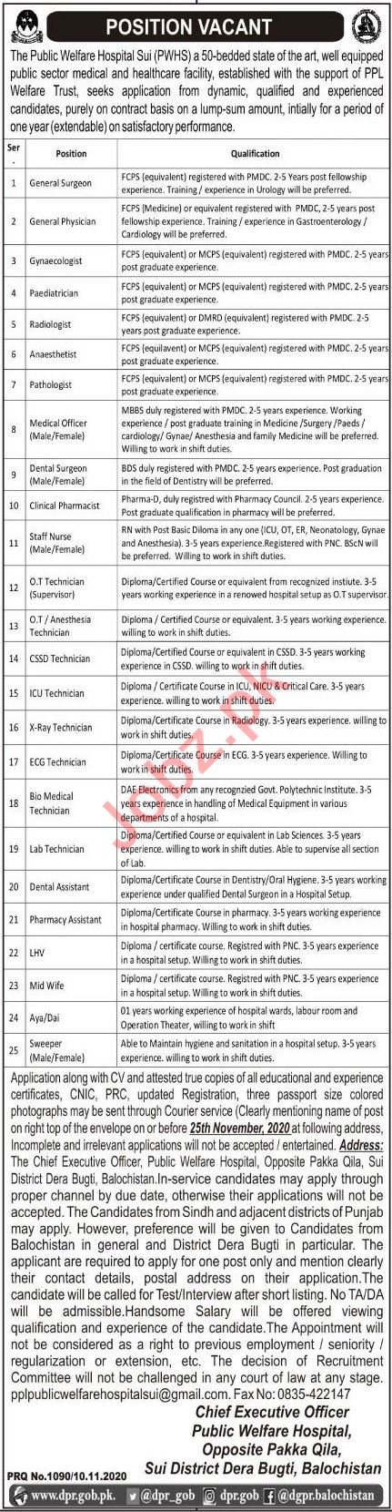 Public Welfare Hospital Sui PWHS, Pakistan Petroleum Limited PPL, Balochistan is seeking candidates for the posts of General Surgeon, General Physician, Gynaecologist, Paediatrician, Radiologist, Anaesthetist, Pathologist, Medical Officer, Female Medical Officer, Dental Surgeon, Clinical Pharmacist, Staff Nurse, Nurse, Pharmacist, OT Technician, OT Technician Supervisor, Anesthesia Technician, CSSD Technician, ICU Technician, X Ray Technician, ECG Technician, Bio Medical Technician, Lab Technician, Dental Assistant, Pharmacy Assistant, LHV, Lady Health Visitor, Midwife, Aya, Dai, Sweeper.