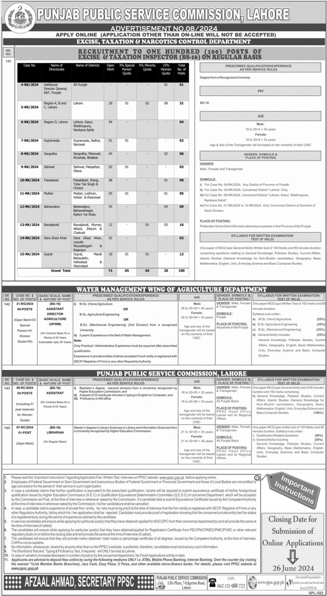 Specialized Healthcare & Medical Education Department, Housing Urban Development & Public Health Engineering Department, Faisalabad Development Authority FDA, Traffic Engineering & Transport Planning Agency TEPA, Lahore Development Authority LDA, Excise Taxation & Narcotics Control Department, Water Management Wing, Agriculture Department, Punjab Public Service Commission PPSC Lahore, mandi bahauddin, rajanpur, jhelum, rahim yar khan, toba tek singh, vehari, narowal, gujrat, mianwali, bahawalpur, lodhran, kasur, multan, wazirabad, khanewal, muzaffargarh, bhakkar, rawalpindi, chakwal, jhang, khushab, nankana sahib, sialkot, pakpattan, sahiwal, layyah, murree, bahawalnagar, faisalabad, dera ghazi khan, sargodha, chiniot, attock, gujranwala, hafizabad and sheikhupura Punjab Pakistan invites applications from eligible candidates for the post of professor, associate professor, professor pathology, assistant professor neurology, assistant director engineering, professor cardiac surgery, assistant director town planning, assistant director agriculture, excise taxation inspector, librarian, assistant director engineering civil, assistant director, assistant, associate professor pharmacology and assistant professor as per advertisement of June 6, 2024 published in daily Jang Newspaper. Candidates with Others, Master, Bachelor, Phd, MBBS, Mphil, B.E, M.sc, MS and BA etc. educational background will be preferred.