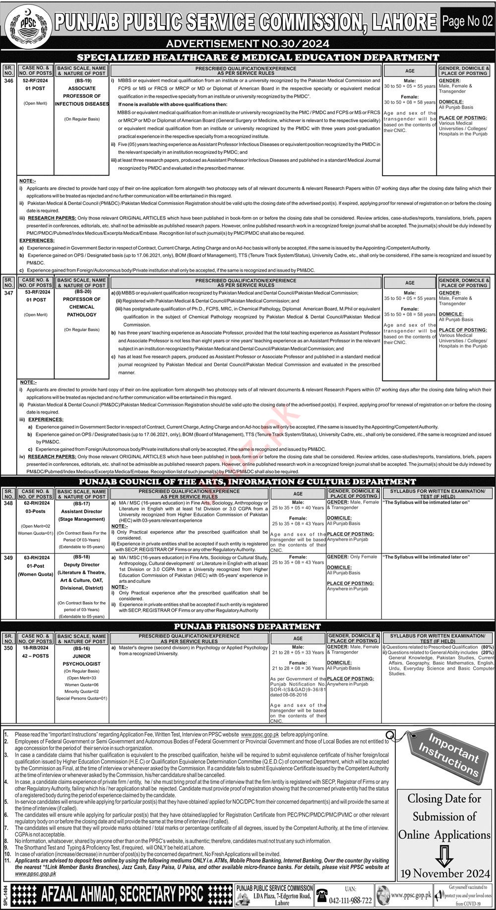 Vacant posts including deputy director, assistant director stage management, associate professor paediatric plastic surgery, professor of chemical pathology, associate professor paediatric anaesthesiology, associate professor pardiatric urology, associate professor radiotherapy, associate professor critical care, psychologist, associate professor, associate professor infectious diseases and associate professor icu are announced in Punjab Public Service Commission PPSC Lahore, lahore Punjab Pakistan as per 3 November 2024 advertisement in daily Jang Newspaper. Preferred Education is Mphil, MBBS, Master and MS etc.