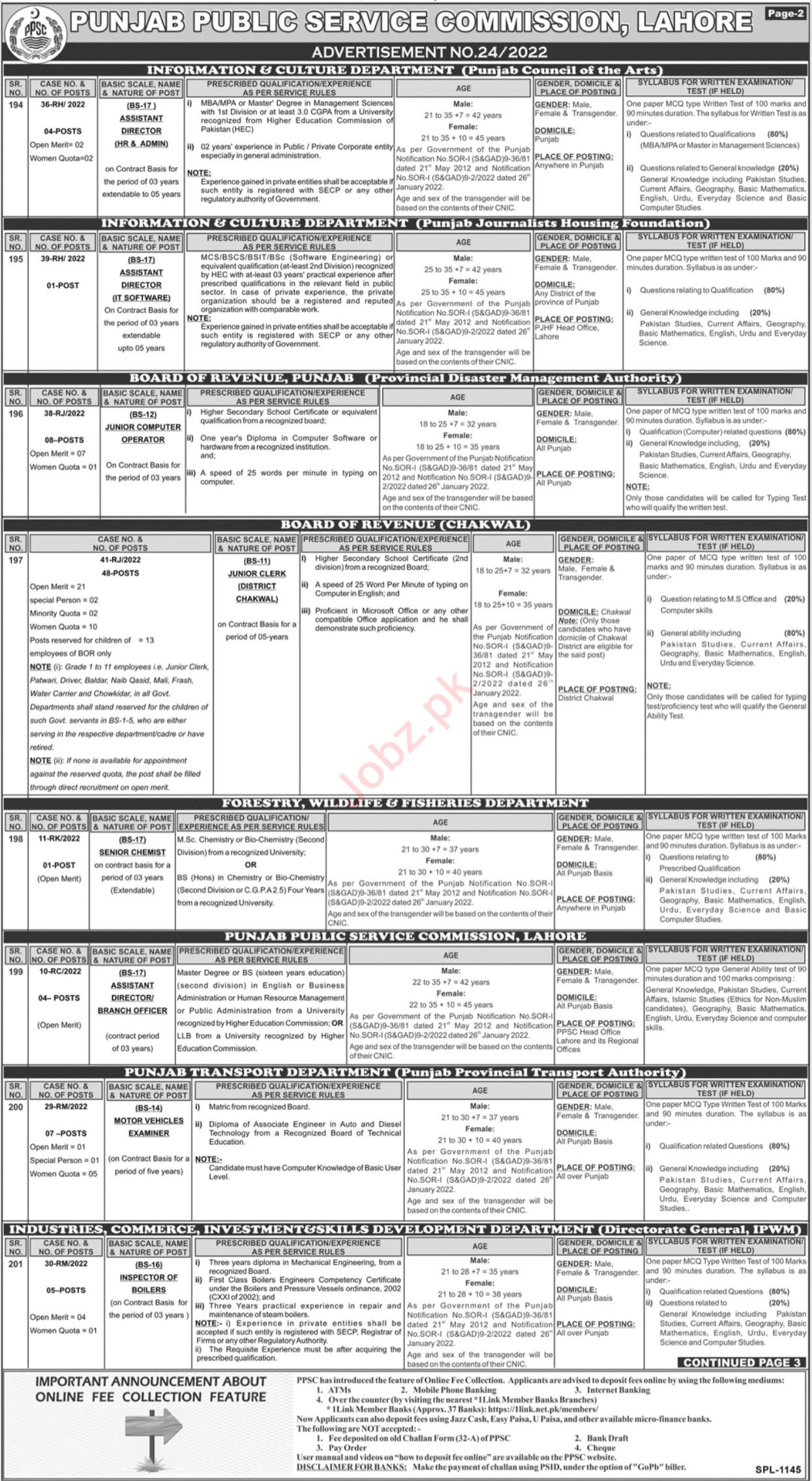 Punjab Public Service Commission PPSC Lahore, lahore Punjab Pakistan invites applications from eligible candidates for the post of assistant librarian, assistant director traffic engineer planing, computer operator, assistant director it software, branch officer, computer officer, clerk, motor vehicle examiner, inspector of boiler, librarian, asistant, assistant director hr admin, assistant director architect, chemist, assistant, assistant director computer and child protection officer as per advertisement of September 25, 2022 published in daily Jang Newspaper. Candidates with MCS, Bachelor, Intermediate, Master, Matric and MS etc. educational background will be preferred.