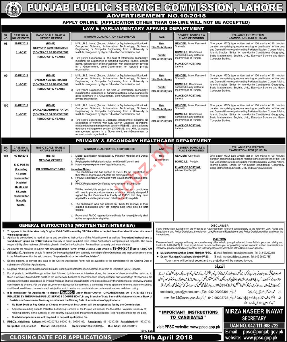 Punjab Public Service Commission announced vacancies for the posts of MBBS Medical Officers, Network Administrator, System Administrator and Database Administrator in the Departments of Primary and Secondary Healthcare Department and, Law & Parliamentary Affairs Department.
