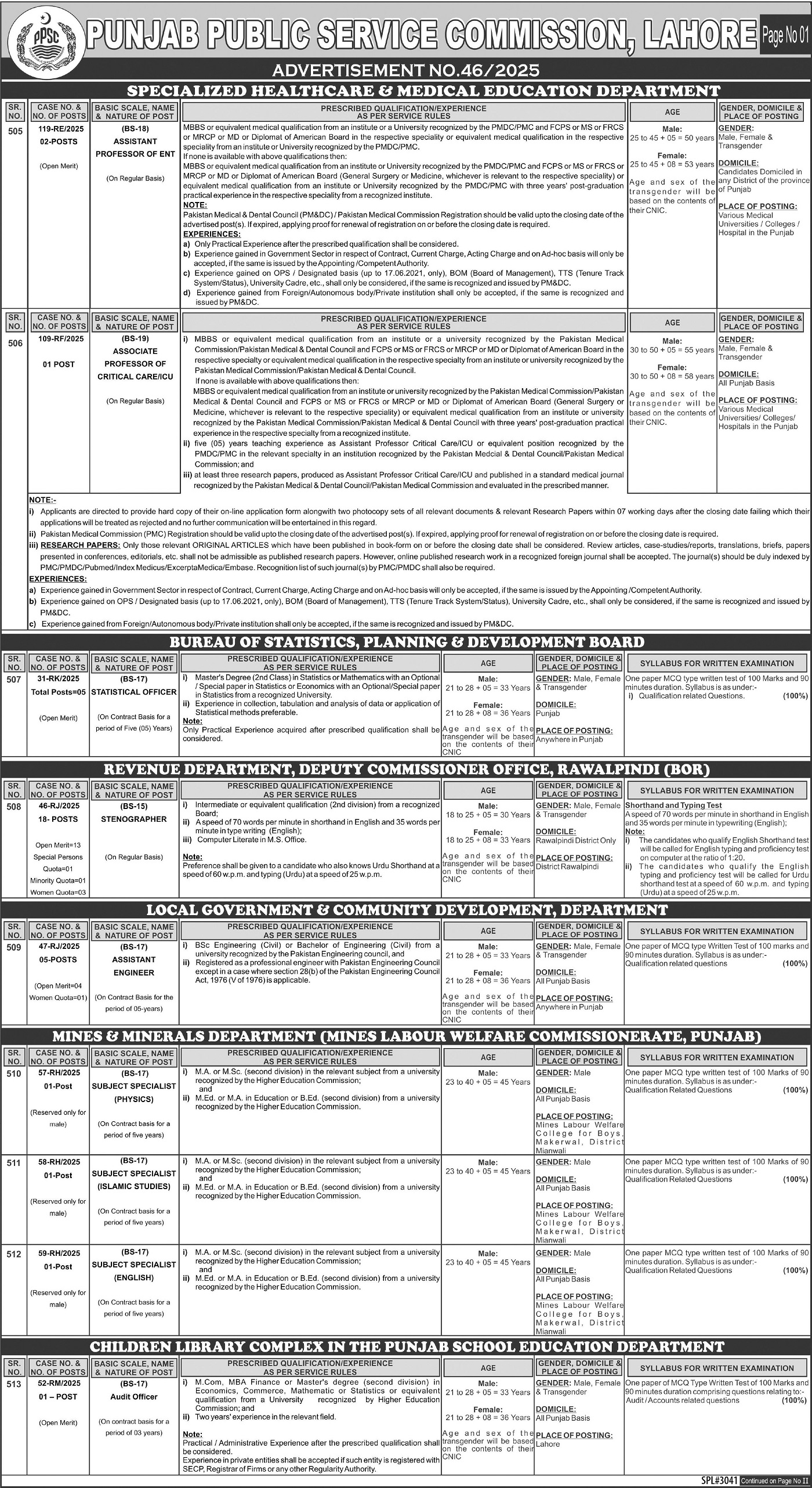 Punjab Public Service Commission PPSC invites applications for job positions advertised in daily Dunya dated 6 December 2025 for following vacancies in Egerton Road Lahore, lahore Punjab Pakistan.