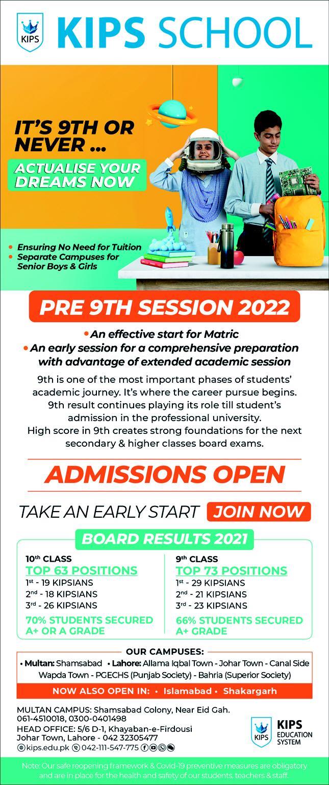 KIPS School has announced admissions 2022 for Pre 9th. Students can enroll for admissions in KIPS School Lahore Punjab Pakistan for academic year 2022 to continue campus based or online education in School. Eligible students with qualification criteria Matric can enroll as per Private admission policy 2022 till closing date. Read newspaper ad for exact details.