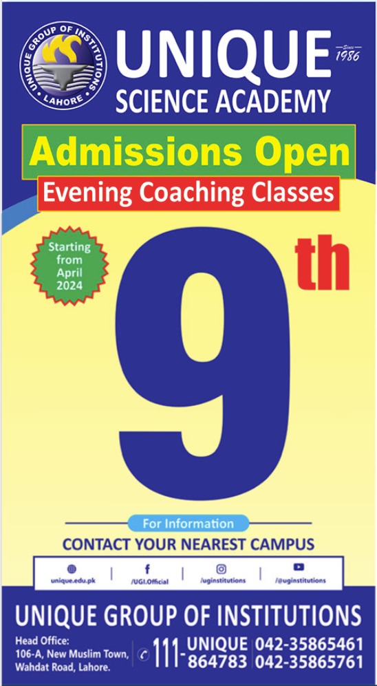 Admissions in Unique Science Academy 2024 for 9th Class has been announced. Eligible students can apply for academic admissions 2024 in Unique Science Academy Lahore Punjab Pakistan for Science School. Eligible candidates for admissions in Matric can apply as per Private institute criteria and before closing date 30 April 2024 after reading advertisement online. Read newspaper ad for exact details.