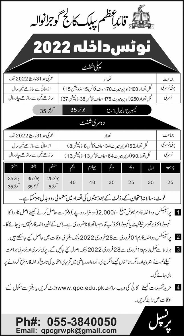 Quaid e Azam Public College has announced admissions 2022 for Pre nursery, Nursery, Class 1 to Class 8th. Eligible students can apply for academic admissions 2022 in Quaid e Azam Public College Gujranwala Punjab Pakistan for Arts College. Students who want to enroll for academic session 2022 in Primary and Middle qualification and admission criteria for Private institute can apply till last date 15 February 2022. Read newspaper ad for exact details.