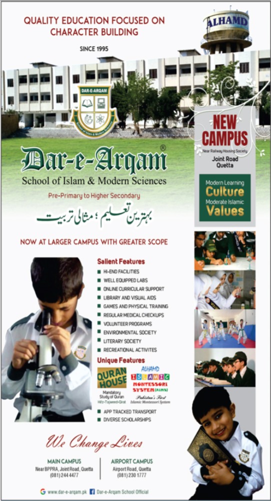 Admissions in Dar e Arqam School of Islam & Modern Sciences 2023 for Nursery Class to 12th Class has been announced. Eligible students who qualify as per admission criteria in Dar e Arqam School of Islam & Modern Sciences Quetta Balochistan Pakistan can apply in Science School for academic year 2023. Eligible students for fulfilling criteria for admissions in Intermediate, Middle, Matric and Primary can enroll as per Private admission policy 2023 till closing date 19 March 2023. Read newspaper ad for exact details.