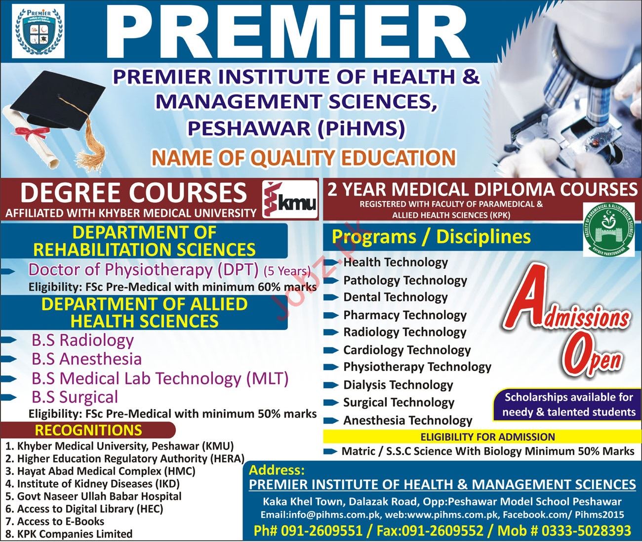 Premier Institute of Health & Management Sciences PIHMS Peshawar, Pakistan are opened admissions fall 2019 for the classes of DPT, BS & Diploma Radiology, Dialysis, Surgical, Cardiology. Read newspaper ad for exact details.