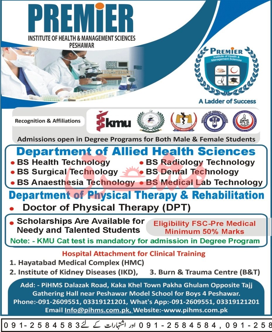 Premier Institute of Health & Management Sciences Doctor of Physical Therapy DPT and BS Allied Health Science Degree Programs admissions 2023 has been announced. Students can enroll for admissions in Premier Institute of Health & Management Sciences Peshawar Khyber Pakhtunkhwa KPK Pakistan for academic year 2023 to continue campus based or online education in Medical Medical College. Students for admissions in BS and DPT & criteria can apply as per Private institute admission policy 2023 before closing date January 10, 2024 as per advertisement. Read newspaper ad for exact details.