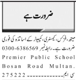 Premier Public School Multan Jobs 2022 For Teachers