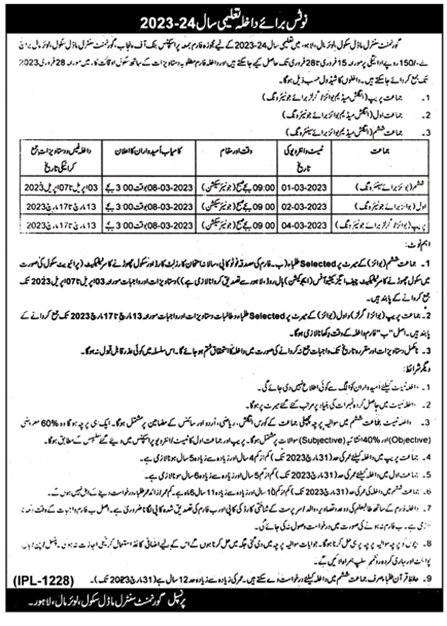Government Central Model School has announced admissions 2023 for Prep Class, 1st Class, 6th Class. Eligible students who qualify as per admission criteria in Government Central Model School Lahore Punjab Pakistan can apply in Science School for academic year 2023. Students for admissions in Primary and Middle can apply for online or campus classes as per Government institute criteria till admission closing date April 7, 2023. Read newspaper ad for exact details.