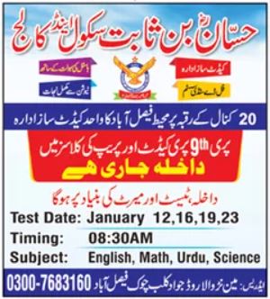 Hassan Bin Sabit Higher Secondary School Prep Class, 9th Class, 10th Class admissions 2023 has been started. Hassan Bin Sabit Higher Secondary School Faisalabad Punjab Pakistan welcomes students to apply for admissions in academic year 2023 in Science College. Students who want to enroll for academic session 2023 in Matric and Primary qualification and admission criteria for Private institute can apply till last date 20 January 2023. Read newspaper ad for exact details.