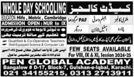 Pen Global Academy admissions 2024 for Intermediate Preparatory Classes has been announced. Students who want to take admissions in Pen Global Academy Karachi Sindh Pakistan for academic year 2024 to continue education in Science College can apply. Students who want to enroll for academic session 2024 in Intermediate qualification and admission criteria for Private institute can apply till last date 4 November 2024. Read newspaper ad for exact details.