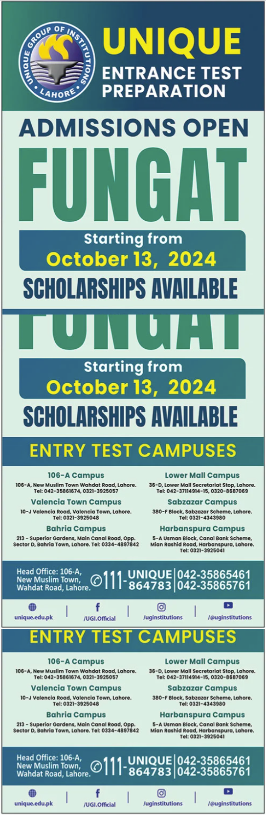 Unique Group of Institutions admissions 2024 for Intermediate Preparatory Classes has been announced. Eligible students can apply for academic admissions 2024 in Unique Group of Institutions Lahore Punjab Pakistan for Science University. Students who want to enroll for academic session 2024 in Intermediate qualification and admission criteria for Private institute can apply till last date 4 November 2024. Read newspaper ad for exact details.