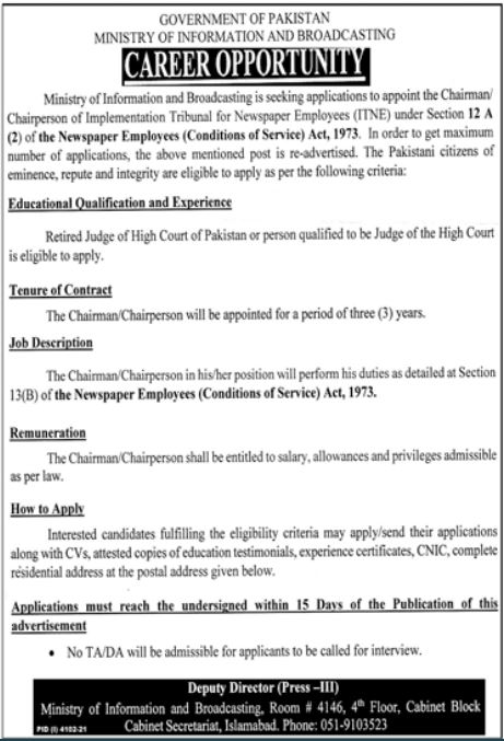 Vacancies in Ministry of Information and Broadcasting Advertisement December 2021
