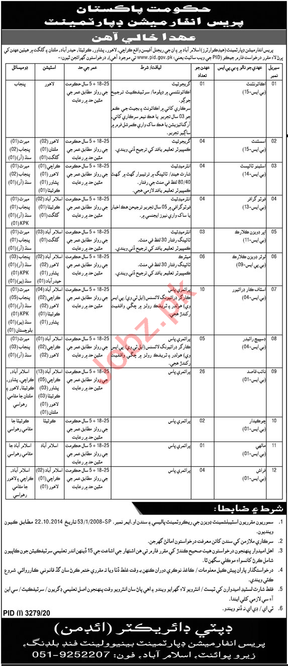 Press Information Department PID Islamabad, Ministry of Information Broadcasting National History and Literary Heritage, Government of Pakistan seeks services for Accountant, Assistant, Stenotypist, Photographer, Upper Division Clerk, UDC, Clerk, Lower Division Clerk, LDC, Staff Car Driver, LTV Driver, PSV Driver, Dispatch Rider, Naib Qasid, Chowkidar, Mali, Farash.