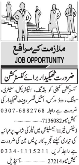 Private Company Karachi, karachi Sindh Pakistan invites applications from eligible candidates for the post of tailor, construction contractor and press man as per advertisement of August 12, 2023 published in daily Jang Newspaper. Intermediate, Matric and Middle etc. educational qualification will be preferred.