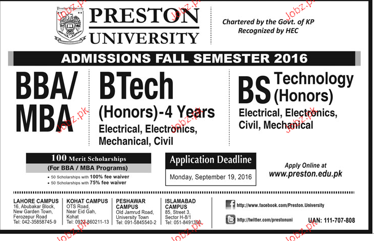 Preston University Admission in BBA, BSCS, MBA and MSc in Kohat. Read newspaper ad for exact details.
