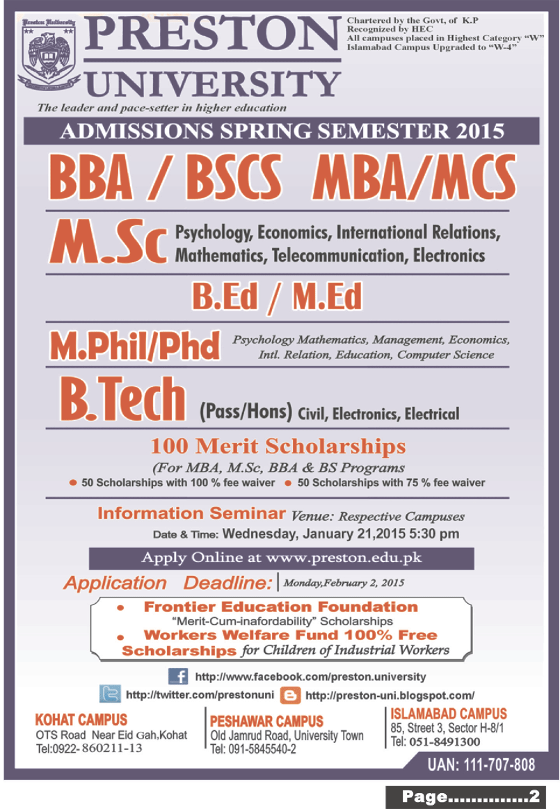 Preston University Admission in BBA, MBA and B.Tech in Kohat. Read newspaper ad for exact details.