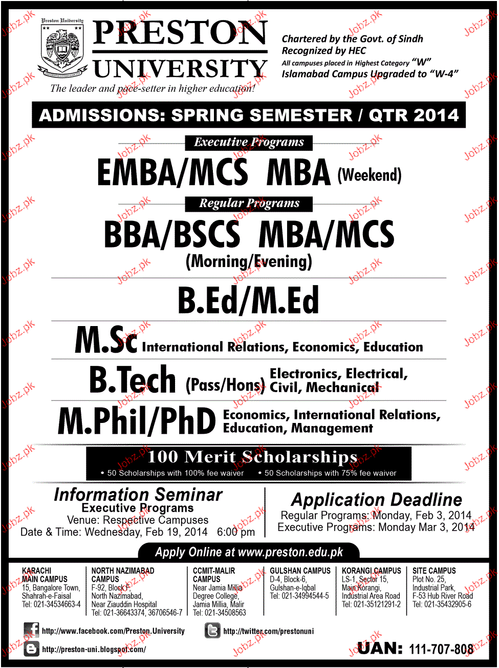 Preston University Admission in BBA,MBA, MCS, Mphill and Phd in Karachi Read newspaper ad for exact details.