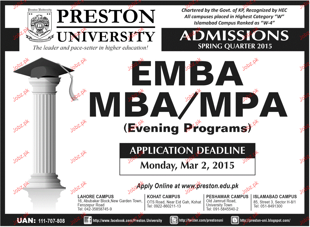 Preston University Admission in EMBA, MCS, MBA and MPA in Lahore. Read newspaper ad for exact details.