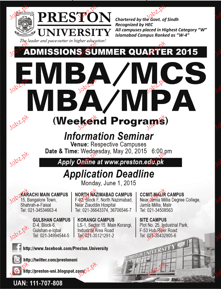 Preston University Admission in EMBA, MCS, MBA and MPA in Lahore. Read newspaper ad for exact details.