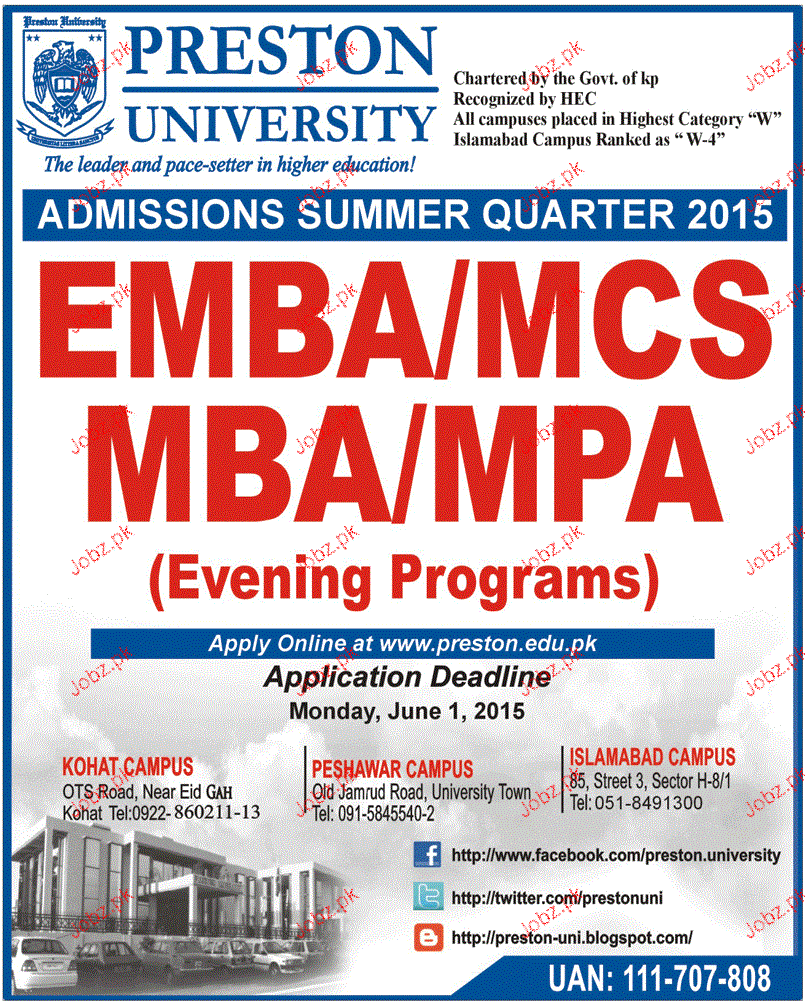 Preston University Admission in EMBA, MCS, MBA and MPA in Kohat. Read newspaper ad for exact details.