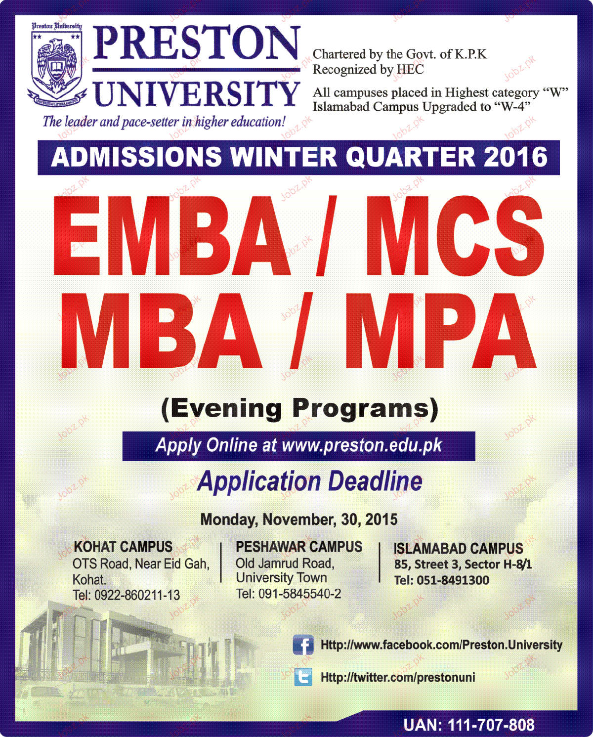 Preston University Admission in EMBA, MCS, MBA and MPA in Kohat. Read newspaper ad for exact details.