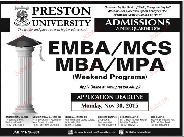 Preston University Admission in EMBA, MCS, MBA and MPA in Lahore. Read newspaper ad for exact details.