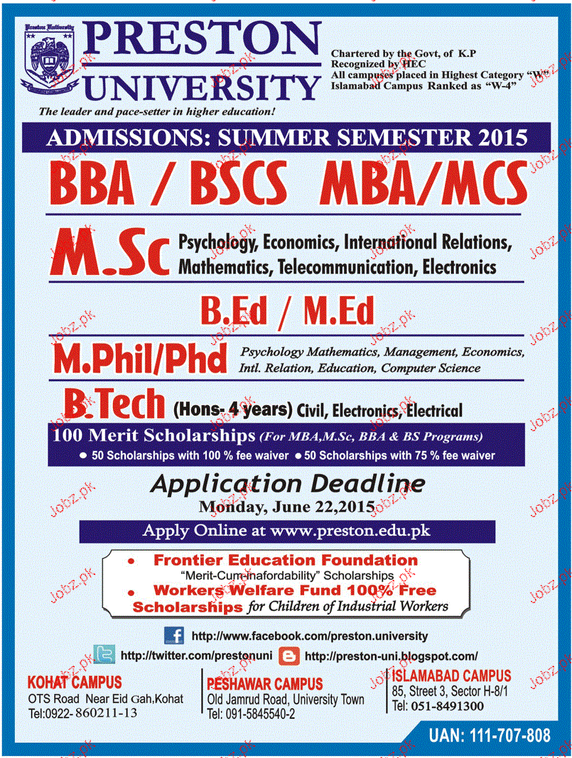 Preston University Admission in EMBA, MCS, MBA, BBA, B.Ed and Phd in Kohat. Read newspaper ad for exact details.