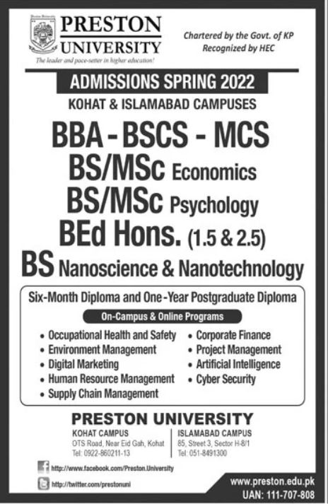 Preston University BS, BSCS, BBA, MCS, MSC, B.Ed admissions 2022 has been started. Students who want to take admissions in Preston University Islamabad Islamabad Pakistan for academic year 2022 to continue education in Other University can apply. Students for admissions in BS, BCS, B.ed and MCS & criteria can apply as per Private institute admission policy 2022 before closing date March 6, 2022 as per advertisement. Read newspaper ad for exact details.