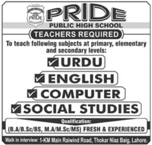 Pride Public High School Lahore, lahore Punjab Pakistan invites applications from eligible candidates for the post of urdu teacher, english teacher, social studies teacher and computer teacher as per advertisement of April 3, 2022 published in daily Jang Newspaper. Educational qualifications required M.ed, MS and Master etc.