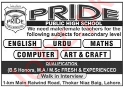 Latest Pride Public High School Teaching Posts Lahore 2025