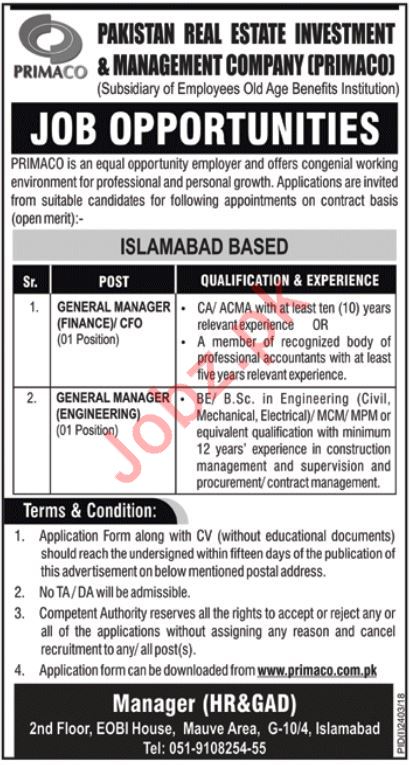 Latest Pakistan Real Estate Investment & Management Company PRIMACO Management Posts Islamabad 2025
