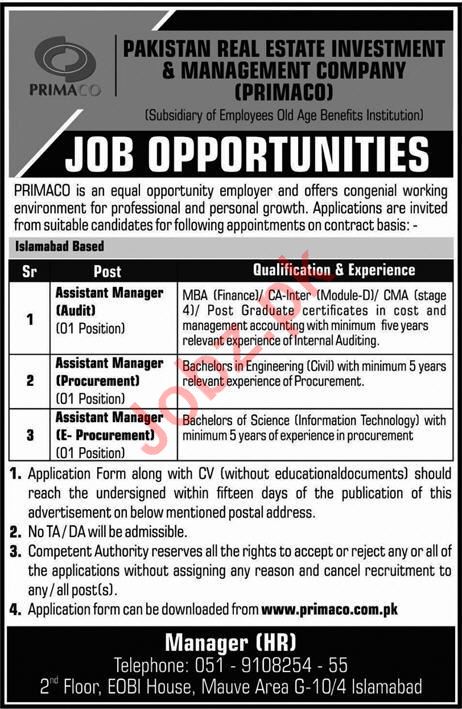 Latest Pakistan Real Estate Investment & Management Company PRIMACO Management Posts Islamabad 2025