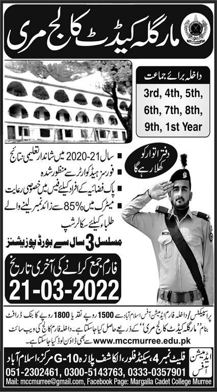 Admissions in Margalla Cadet College 2022 for 3rd Class, 4th Class, 5th Class, 6th Class, 7th Class, 8th Class, 9th Class, 1st Year has been announced. Margalla Cadet College Murree Punjab Pakistan welcomes students to apply for admissions in academic year 2022 in Science College. Eligible students for fulfilling criteria for admissions in Intermediate, Middle, Primary and Matric can enroll as per Private admission policy 2022 till closing date 21 March 2022. Read newspaper ad for exact details.
