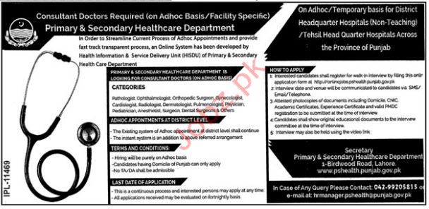 Primary & Secondary Healthcare Department has announced Vacancies at All District Level for the post of Pathologist, Ophthalmologist , Orthopedic, Surgeon, Gynecologist, Cardiologist, Radiologist, Dermatologist, Pulmonologist, Physician, Pediatrician, Anesthetist, Surgeon, Dental Surgeon in Lahore.