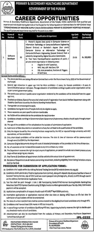Primary & Secondary Healthcare Department latest Government IT jobs and others can be applied till 2 April 2024 or as per closing date in newspaper ad. Read complete ad online via NTS to know how to apply on latest Primary & Secondary Healthcare Department job opportunities. Some jobs in Primary & Secondary Healthcare Department may require skills like ASP.NET, Core PHP, SQL, Angular, MVC and C# Programming. Salary varies from 200000.