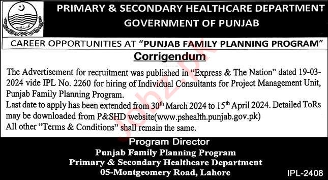 Vacant posts including consultant and individual consultant are announced in Primary & Secondary Healthcare Department Lahore, lahore Punjab Pakistan as per 24 March 2024 advertisement in daily Express Newspaper. Educational qualifications required Others, P.G Diploma and MBBS etc.