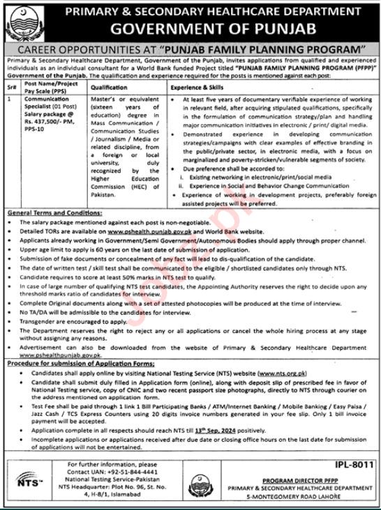 Primary and Secondary Healthcare Department is looking for candidates for following posts as per job advertisement published in daily Jang Newspaper of August 25, 2024 for location Lahore, lahore Punjab Pakistan: