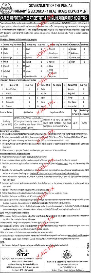 Latest Primary & Secondary Healthcare Department Data Entry Posts Lahore 2025