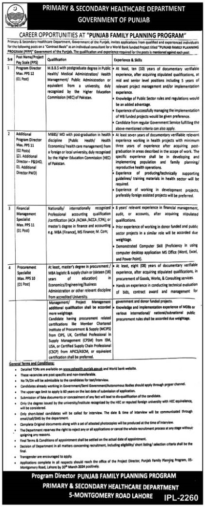 Primary & Secondary Healthcare Department Lahore Jobs 2024