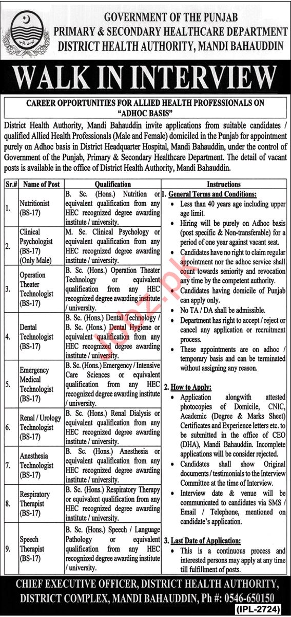 Government of The Punjab Primary & Secondary Healthcare Department District Health Authority invites applications from medical, health and technical personnel for the posts of Nutritionist, Clinical Psychologist, Operation Theater Technologist, Dental Technologist, Emergency Medical Technologist, Anesthesia Technologist, Renal Technologist, Urology Technologist, Respiratory Therapist, Speech Therapist in Mandi Bahauddin Punjab 2019.