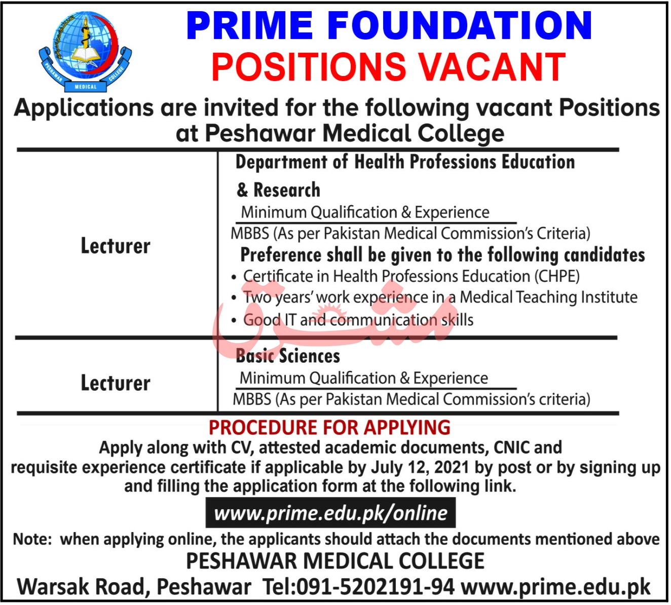 Prime Foundation is seeking applications from experienced, hardworking and dynamic candidates against the vacant posts of Lecturer in Department of Health Professional Education and Research, Lecturer in Basic Sciences in Peshawar.