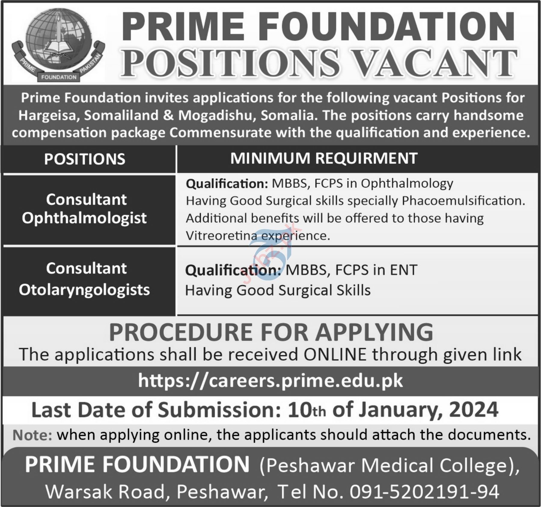 Vacant posts including consultant ophthalomogist and consultant otolaryngologist are announced in Prime Foundation Peshawar, peshawar Khyber Pakhtunkhwa KPK Pakistan as per 31 December 2023 advertisement in daily Aaj Newspaper. MBA etc. educational qualification will be preferred.