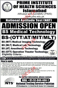 Prime Institute of Health Sciences Islamabad Admission in BS OTT / AT / MIT / MLT, BS Medical Technology, BS Medical Lab Technology and BS OTT Operation Theater Technology in Islamabad. Read newspaper ad for exact details.