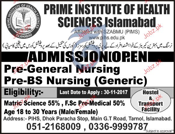 Prime Institute of Health Sciences Admission in Pre General Nursing and Pre BS Nursing Generic in Islamabad. Admission Open for Both Male / Female Students. Read newspaper ad for exact details.