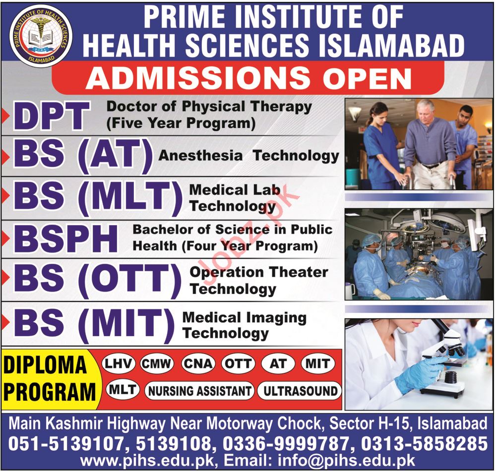 Prime Institute of Heath Sciences PIHS is offering admissions for Doctor of Physical Therapy DPT, BS AT Anesthesia Technology, BS MLT Medical Lab Technology, BSPH Bachelor of Science in Public Health, BS OTT Operation Theater Technology, BS MIT Medical Imaging Technology and Diploma Programs. Read newspaper ad for exact details.