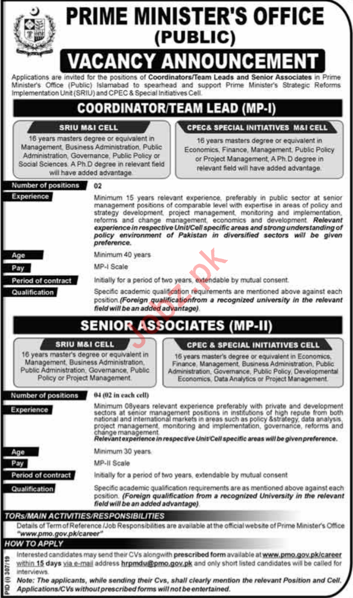 Prime Minister Office Public Jobs 2019 For Islamabad