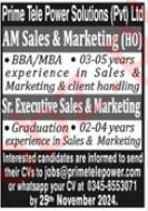 Vacant posts including am sales marketing and executive sales marketing are announced in Prime Tele Power Solutions Ltd Rawalpindi, rawalpindi Punjab Pakistan as per 19 November 2024 advertisement in daily Jang Newspaper. Preferred Education is Bachelor, BBA, Master, MBA and MS etc.