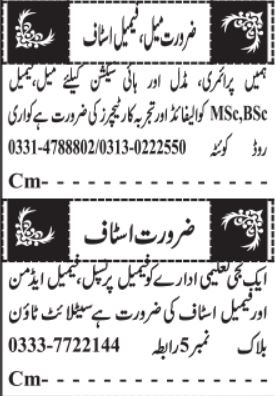 Private School invites applications for job positions advertised in daily Jang dated 17 February 2023 for following vacancies in Quetta, quetta Balochistan Pakistan.